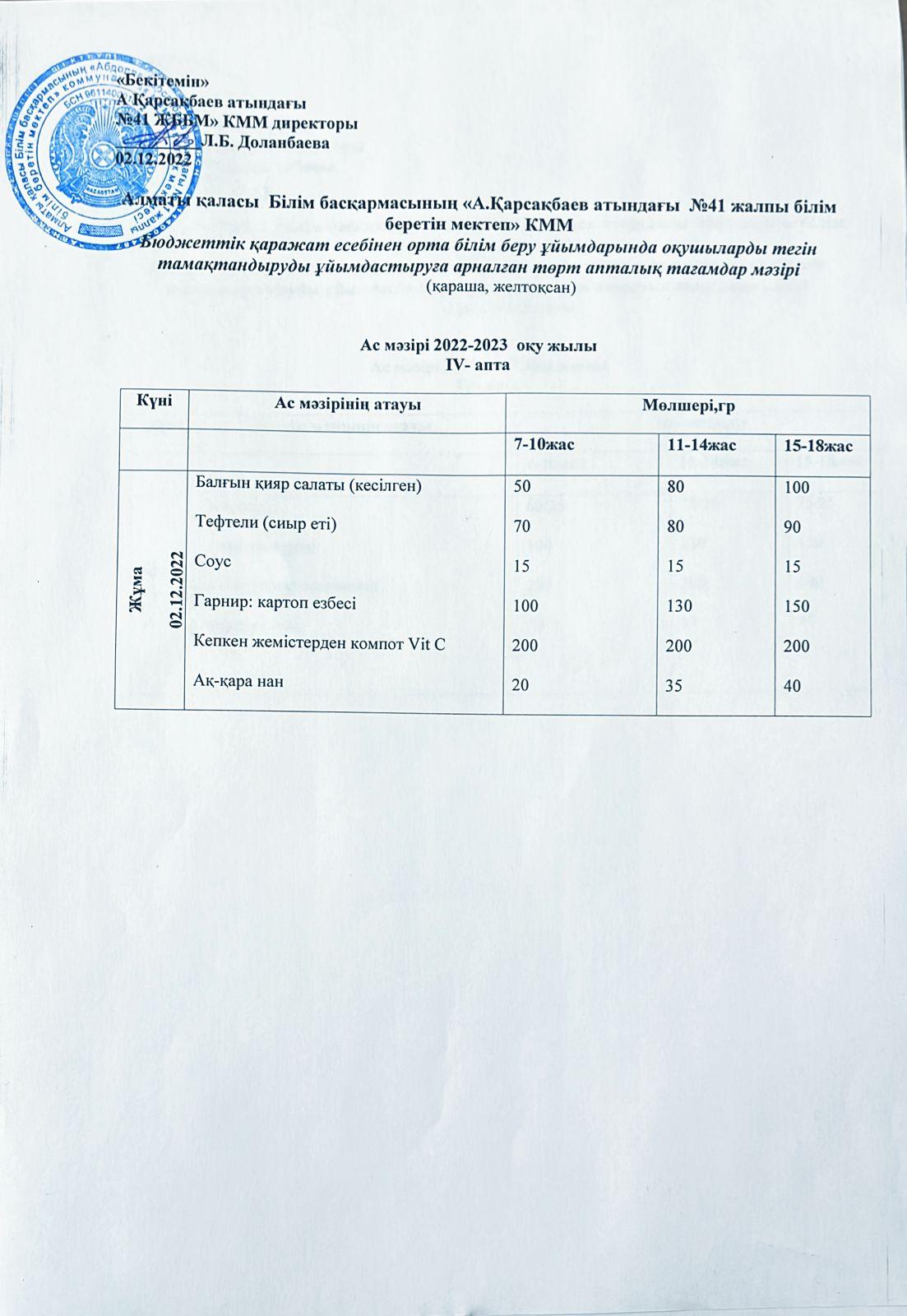 Перспективалық ас мәзірі 2022-2023 оқу жылы (қыркүйек,қазан, қараша,желтоқсан)