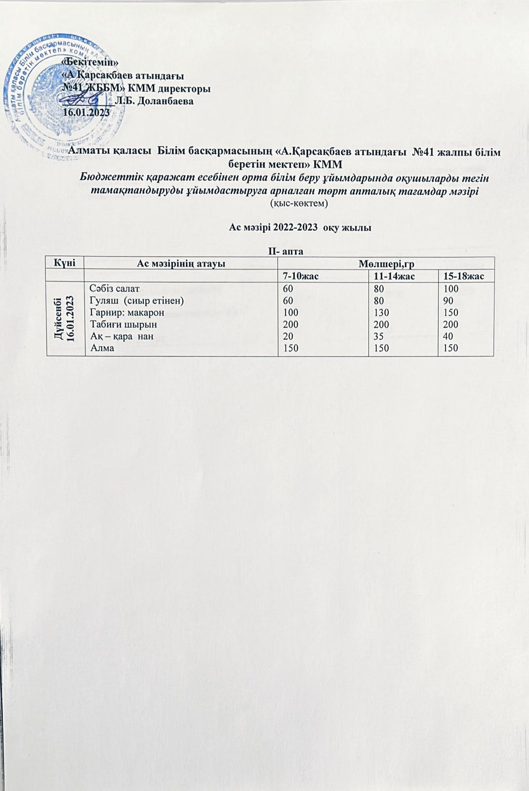 Ас мәзірі 16.01.2023