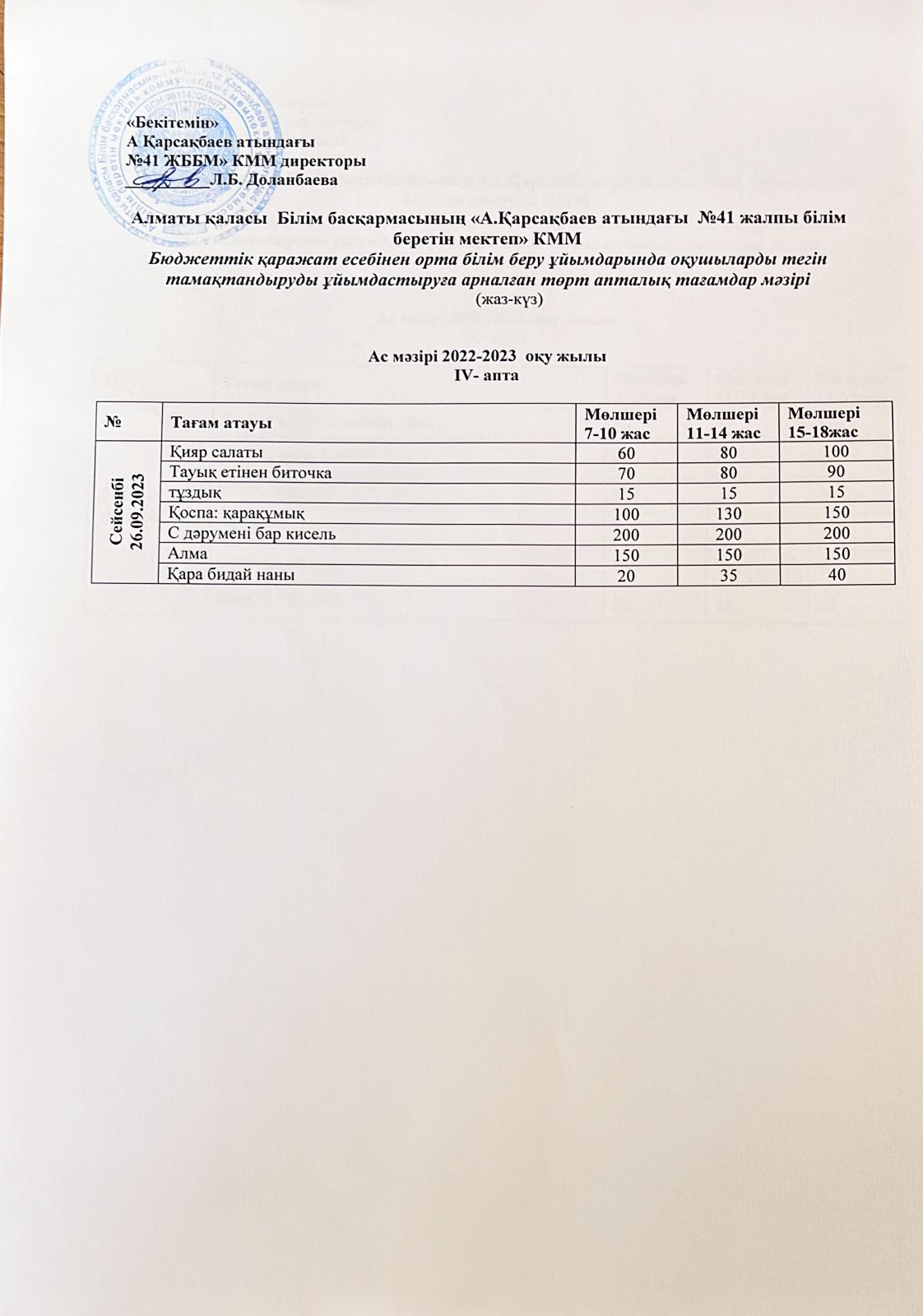 Ас мәзірі 26.09.2023 ж. 4-ші апта 2-ші күн