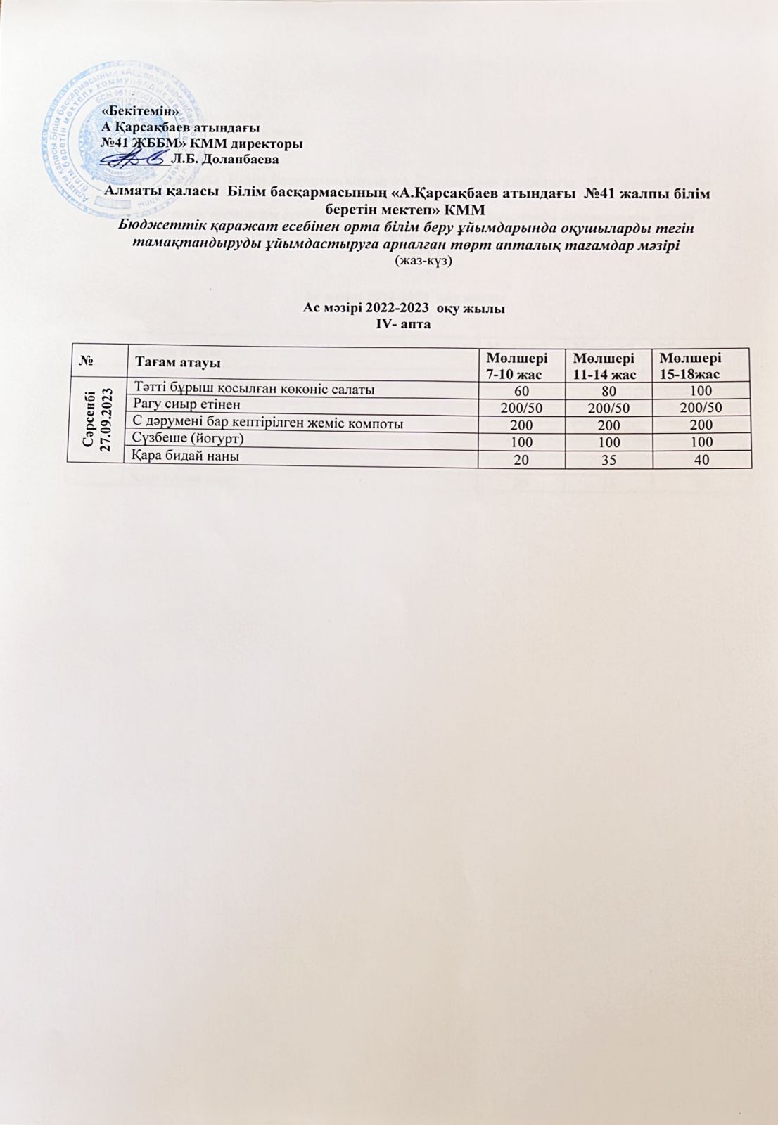 Ас мәзірі 27.09.2023 ж. 4-ші апта 3-ші күн