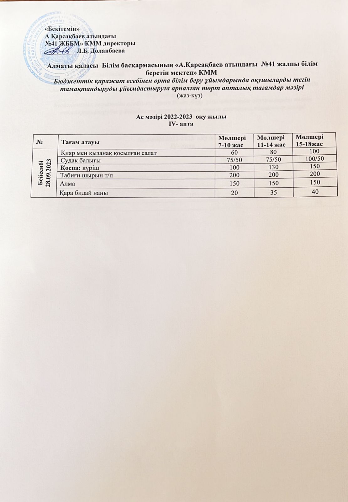 » Ас мәзірі 27.09.2023 ж. 4-ші апта 4-ші күн
