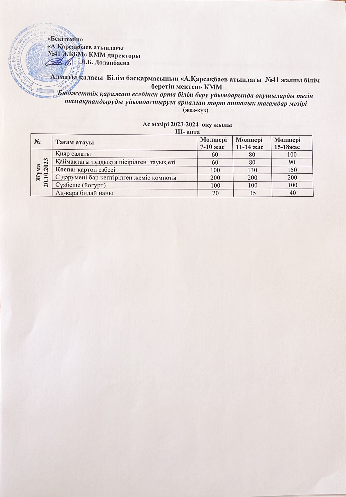 Ас мәзірі 20.10.2023 ж. 3-ші апта 5-ші күн