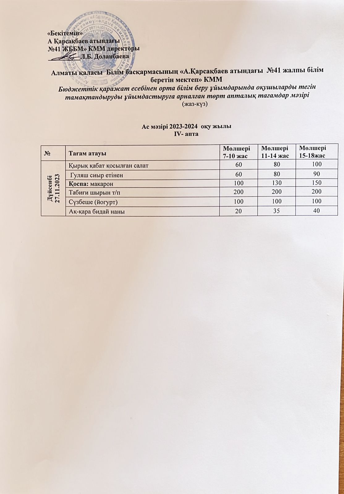 Ас мәзірі 27.11.2023 ж. 4-ші апта 1-ші күн