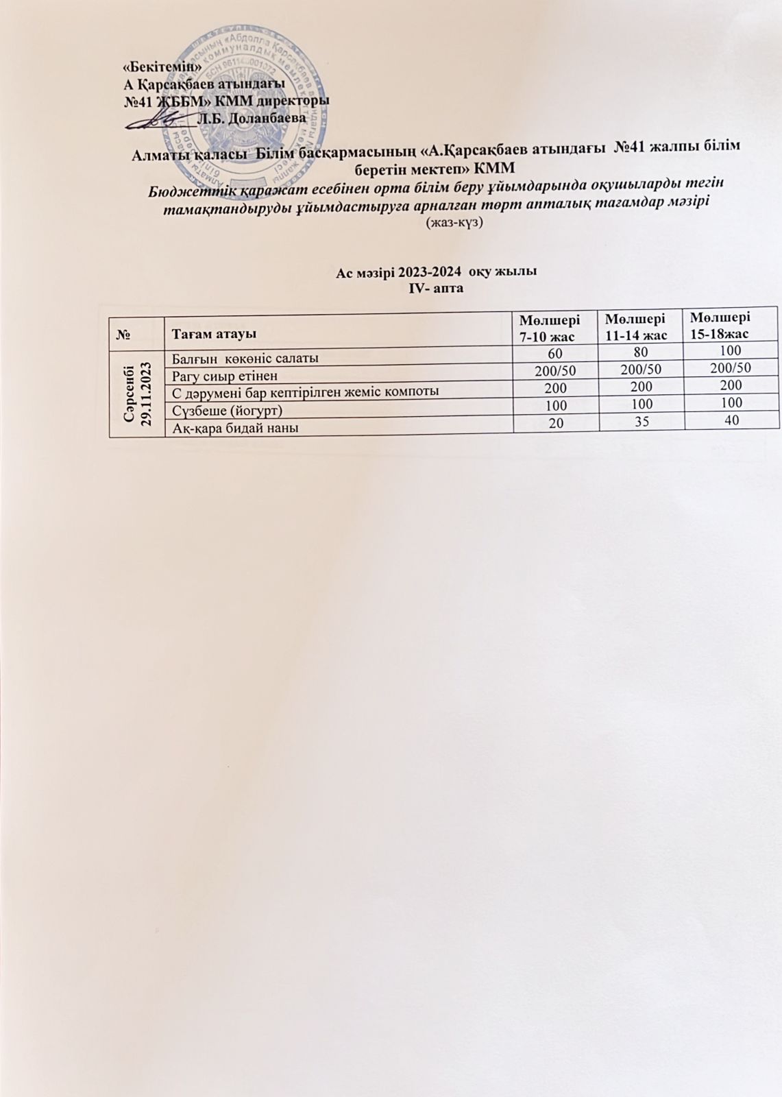 Ас мәзірі 29.11.2023 ж. 4-ші апта 3-ші күн